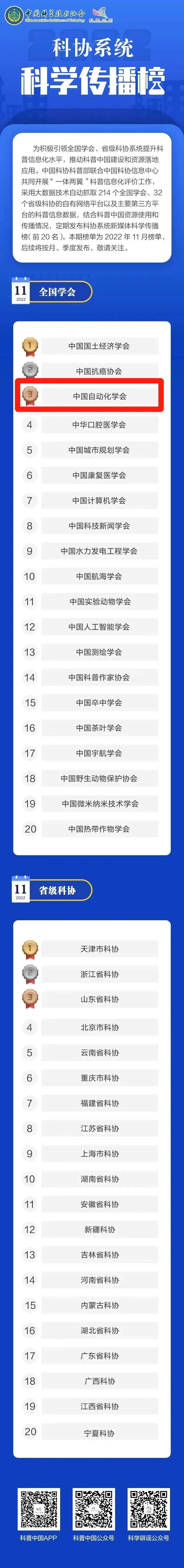 昨日,中国科协发布2022年11月科协系统科学传播榜。中国科协科普部联合中国科协信息中心共同开展“一体两翼”科普信息化评价工作,采用大数据技术自动抓取214个全国学会、32个省级科协的自有网络平台以及主要第三方平台的科普信息数据,结合科普中国资源使用和传播情况,定期发布科协系统新媒体科学传播榜(前20名)。