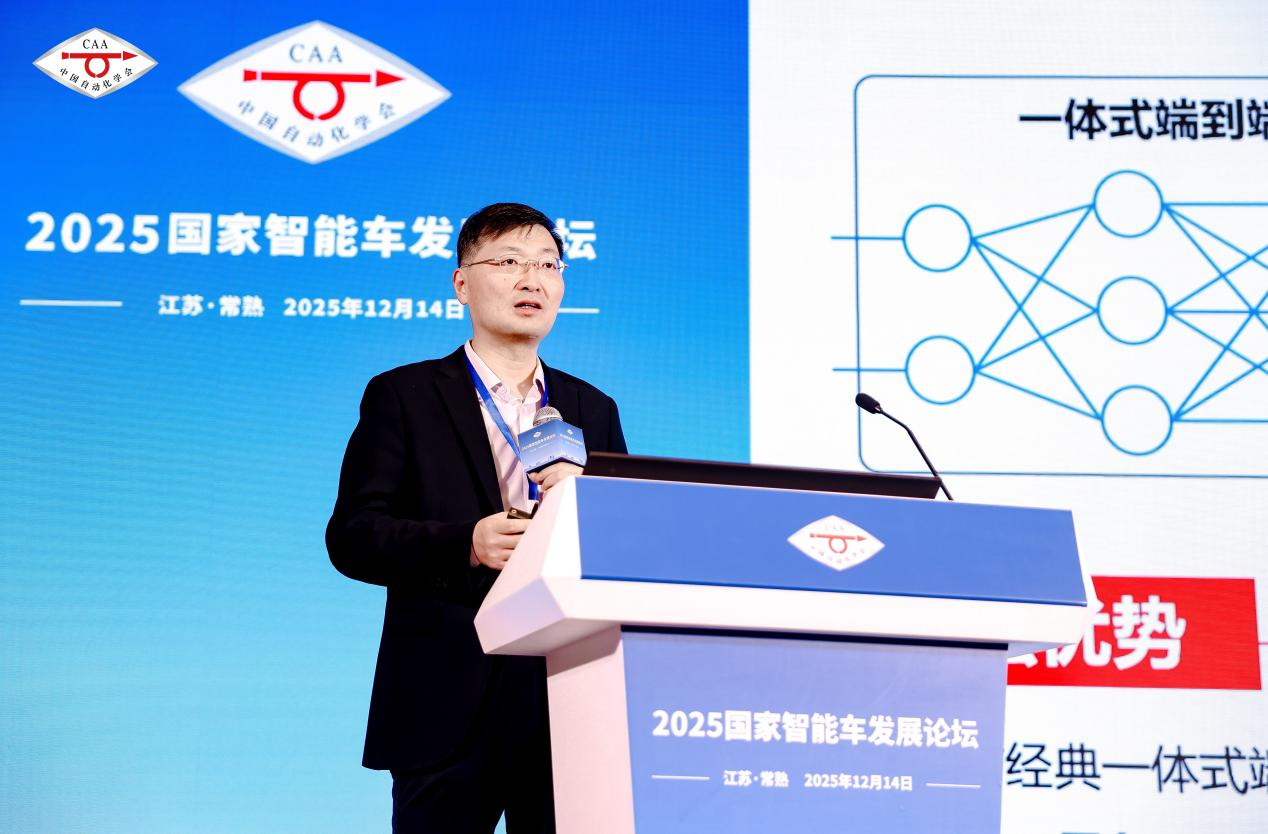 杨明教授在题为“端到端自动驾驶算法设计与城市场景应用实践”的报告中聚焦端到端决策与控制的模型创新及核心算法研发,系统阐述了在碰撞预测、自主跟驰、自动泊车及城市场景自动驾驶等关键任务中的落地应用成果。他指出,传统模块化系统存在环境适配性不足、误差逐层累积等固有局限,而端到端技术通过深度神经网络构建一体化智能框架,能显著提升复杂场景适配能力与系统抗干扰性,有效降低误差累积风险。