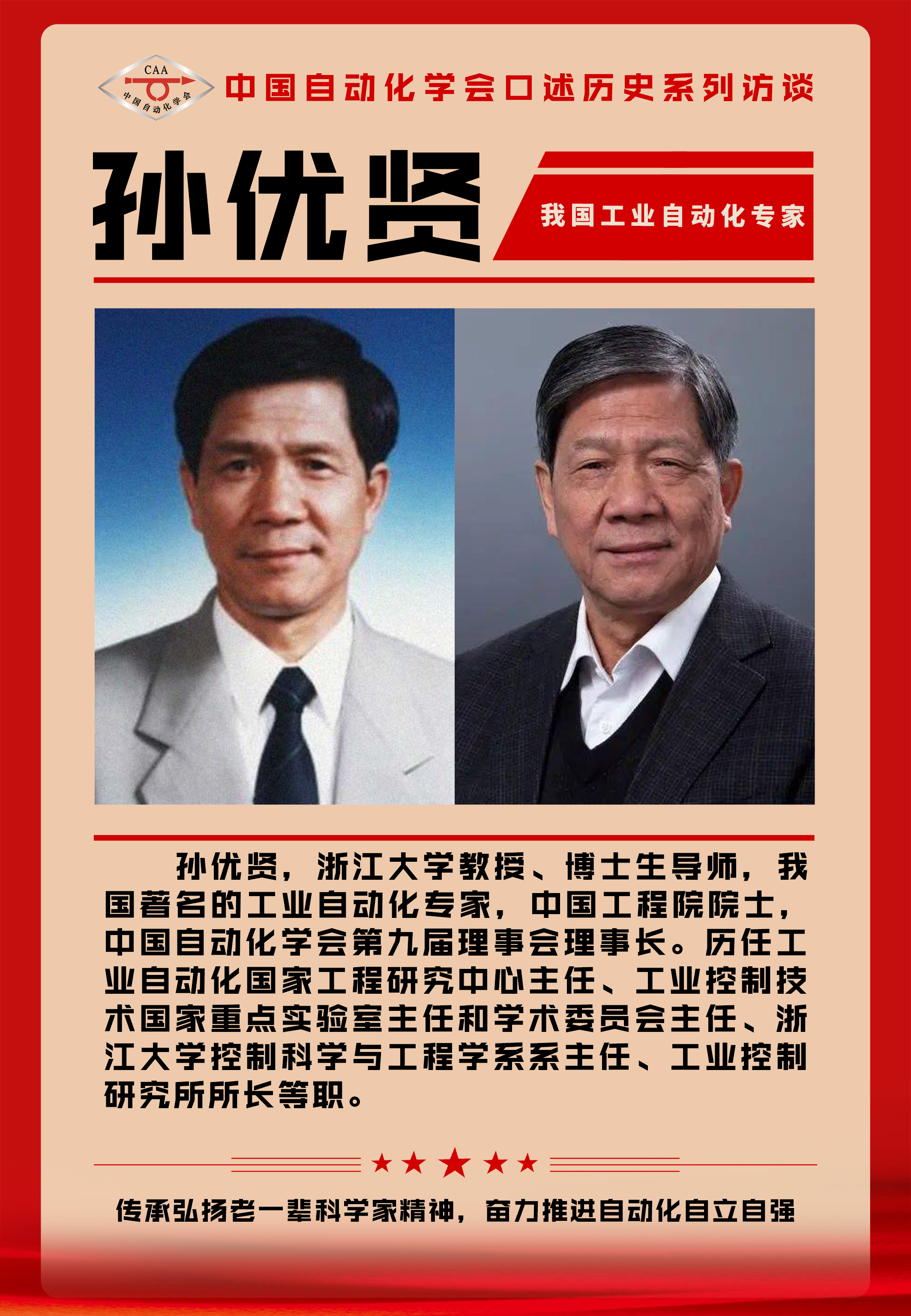 本期学会采访的是孙优贤院士。孙优贤,浙江大学教授、博士生导师,我国著名的工业自动化专家,中国工程院院士,中国自动化学会第九届理事会理事长。历任工业自动化国家工程研究中心主任、工业控制技术国家重点实验室主任和学术委员会主任、浙江大学控制科学与工程学系系主任、工业控制研究所所长等职。