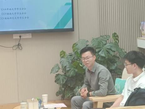 活动伊始,主持人说明活动目的、介绍到场来宾后,罗旗舞进行了致辞,对湖南大学、湖南师范大学CCF分会的同学们表示热烈欢迎,并强调了青年科技人才在"科教兴国、人才强国"战略中的重要性。他指出,三校分会应充分发挥CCF与CAA的平台优势,通过举办学术沙龙、跨校竞赛和搭建线上资源库等方式深化合作,吸引更多优秀学子加入学术共同体,呼吁三校会员常态化联动,在交流中共同成长,展现湖湘学子"敢为人先"的精神风貌。