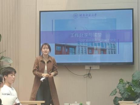 接着,各校分会主席对分会的部门构成、各部门的具体工作和特色活动进行分享。湖南师范大学冯悦雯同学以师大精神为核心,着重介绍了CCF师大分会的活动开展情况、会员发展工作和分会发展的未来期望,令其他分会的成员们受益匪浅。