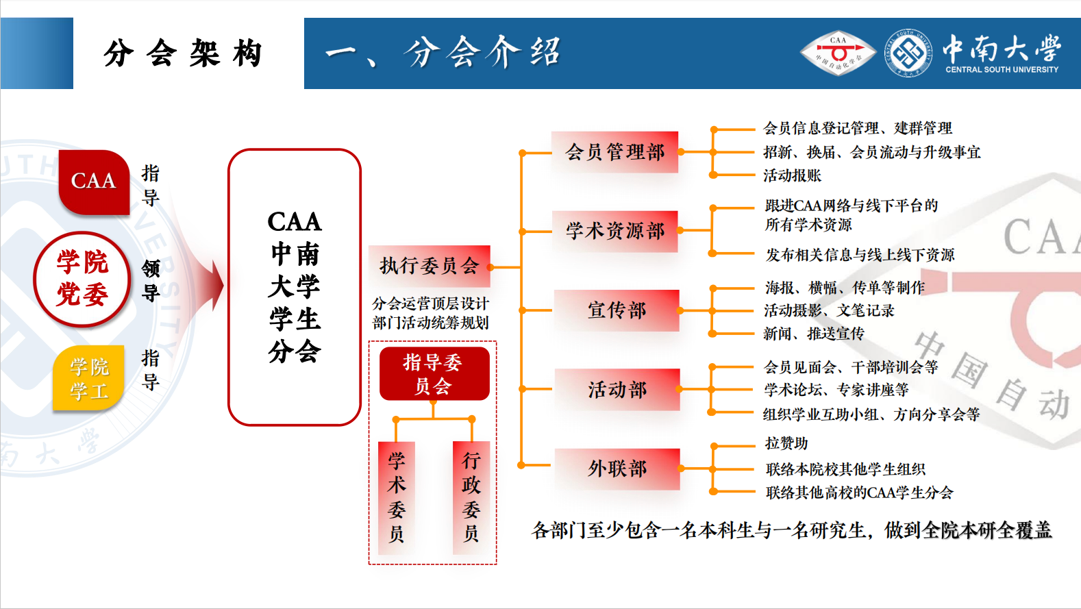 会议最后邀请CAA 中南分会主席邓宇欣详解 “青帆计划” 与 “青年先锋行动” 的核心内容,作为 2024 年度 CAA 学生分会 “活力之星”,CAA中南大学学生分会以 “服务会员成长、传承自动化精神” 为核心,打造了多元化育人平台:“青帆计划” 作为学术交流主阵地,通过 “报告 + 对话” 模式全年开展多期活动,覆盖考研备考、竞赛攻坚等主题,部分线上活动播放量超 5 万人次,为学子搭建起链接专家与朋辈的交流桥梁;“青年先锋行动” 则以 “坚定理想、丰富精神、彰显活力” 为导向,融合学术实践、文体活动与社会公益,既协办研究生学术年会等高端论坛,也开展 “CAA 进校园” 科普支教等公益项目,全面培育学子的创新能力与社会责任感。欢迎各位新生加入CAA,共享学术资源与成长机遇。