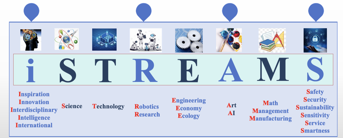 我们秉持平行教育理念,即虚拟与现实结合,核心方法为“干中学、学中干”,通过K21=iSTREAMs+ iCDIOs体系实施平行学习,如图7-8。该体系起源于2013 年QAII开启的教育创新实践,其中教师与学生均为学习者,数字化教师与学生将伴随个体终身,可根据选择持续承担教育角色。教育理念遵循怀特海的观点,即优质教育应避免灌输过多内容,而应专注于精深教学,由此提出“Make a Case for CASE”,将控制自动化理论与新物理、新数学、新化学融合,实现跨学科教学。AI 中的“A”转化为自主Autonomous,并将社会科学与人文科学纳入CASE教育,通过传统三步曲MAC(Modeling, Analysis, Control)、大模型等工具推动从分析到计算认知,从控制Control到收敛Convergence 再到MetaControl和MetaConvergence,实现新的“三步曲MAC”: MetaScience, AI, Circular Causality,最终将小知识转化为大数据,再由大数据形成深度智能。每个行业应将多样性、涌现性与收敛性整合为可教可学的流程,将复杂多变的世界转化为敏捷、聚焦、可控的体系。